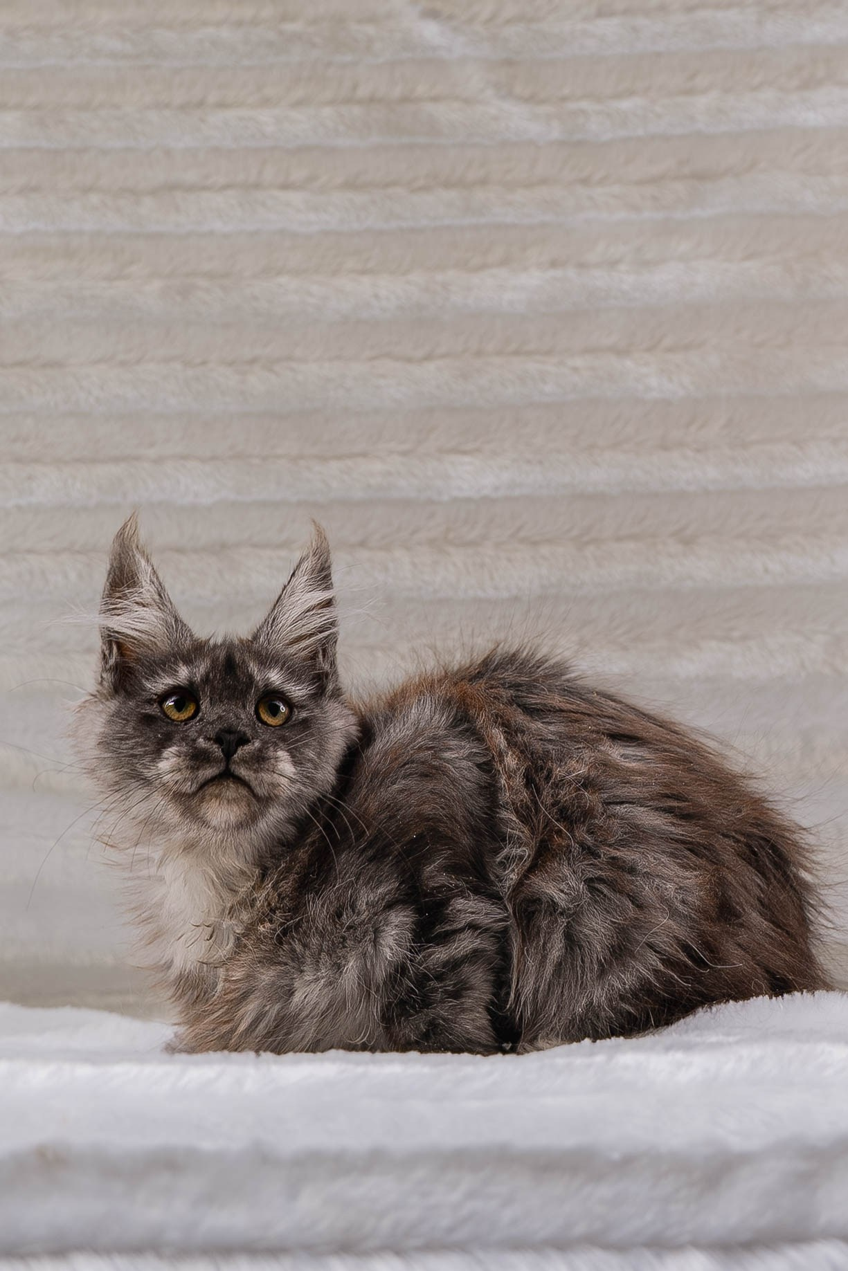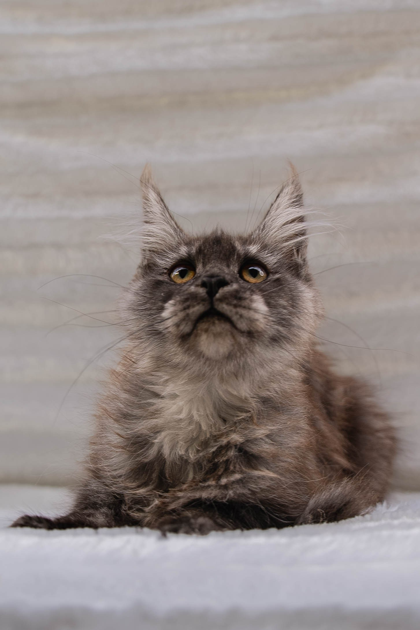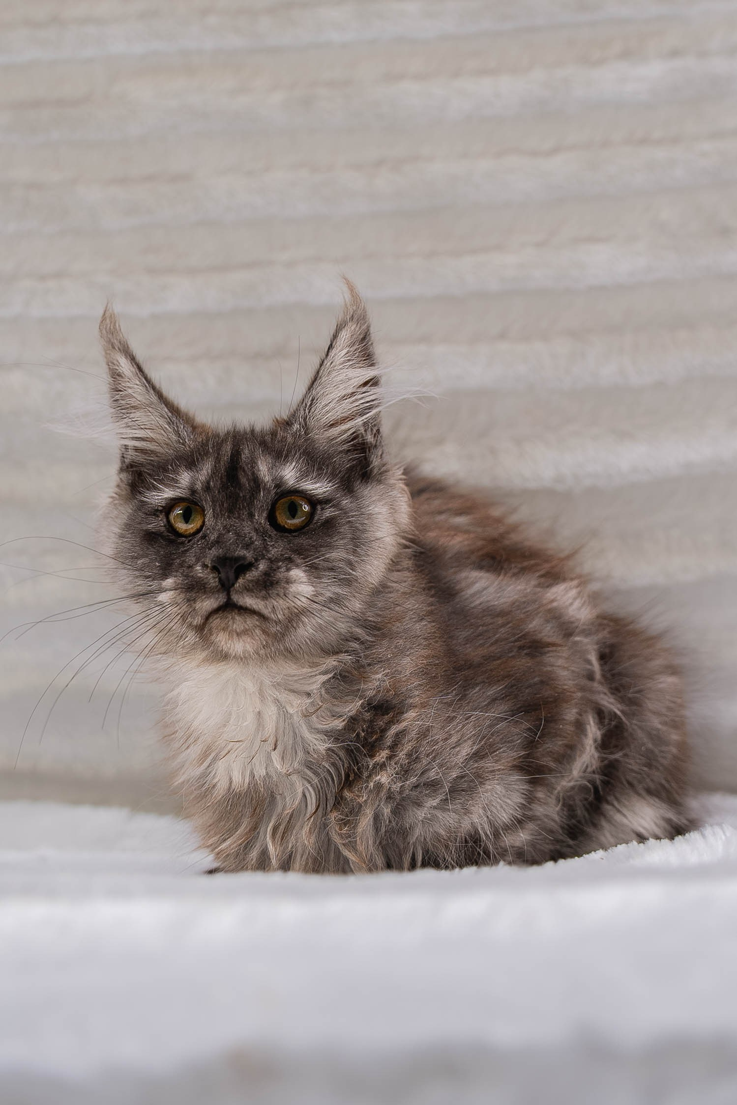 Senator Stella is an unforgettable Maine Coon girl with a dramatic blue tortie smoke coat, luminous golden eyes, and a quiet confidence that feels both regal and irresistibly sweet. Born on September 24, 2025, in the USA to our beloved Charlie and Melissa, Stella carries the elegance, intelligence, and steady affection of her beautiful lineage. Her plush fur is a smoky veil of cool charcoal-blue, softly kissed with warm coppery cream, creating a rich, painterly pattern that makes her look like a little work of art. With her striking lynx-tipped ears, expressive face, and poised posture, Senator Stella turns every moment into a portrait.